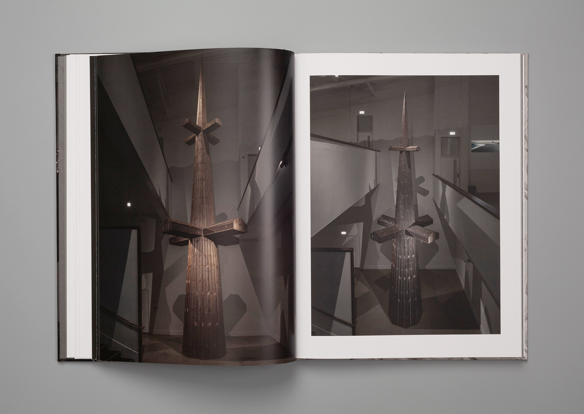 The Tai Moana Tai Tangata publication centres on Brett Graham’s ground-breaking exhibition at the Govett-Brewster Art Gallery in Ngāmotu / New Plymouth. The installation – including 5 large sculptures and 3 projected video artworks presented an immediate design challenge – what form of publication can accommodate the 9.6 metre tall nui Cease Tide of Wrong-Doing, wide-format video works and sweeping views of the installation and do them all justice? A portrait-format book with a series of gatefold pages resulted. The photography of the exhibition is the central feature – capturing the experience of being in the space, the sombre colour palette of the artworks, their installed relationships, and the moody, theatrical lighting. Two separate photo shoots are also threaded into the design – a narrative documentation of the exhibition pōwhiri, and a photo essay of significant sites and memorials that inspired the artworks. The book’s sombre greys and browns are inspired by the sculptures, with the metallic grey reflecting the graphite coating of the carved wagon, Maungārongo ki te whenua, Maungārongo ki te Tangata.