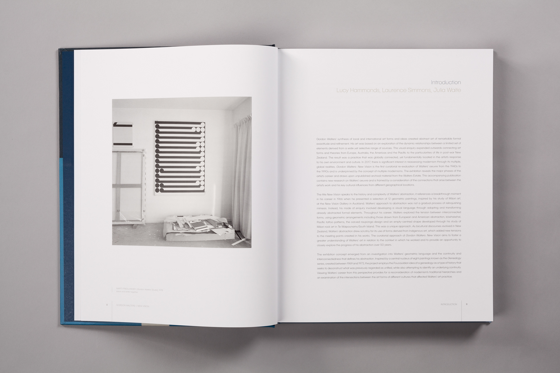 The cover design takes its cue from the striking Painting J, which is complimented by printed fabric split horizontally across the case. The title typography is restrained, using just colour to differentiate the title elements. The full circles of the G and O have a strong resonance with Walters abstracted koru form.